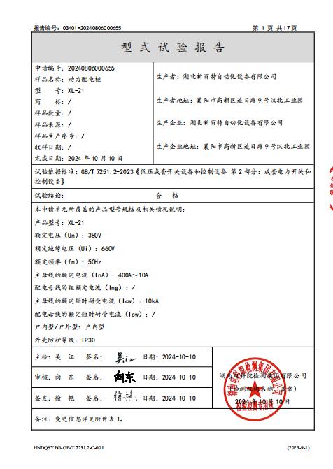動(dòng)力柜XL-21型式試驗(yàn)報(bào)告